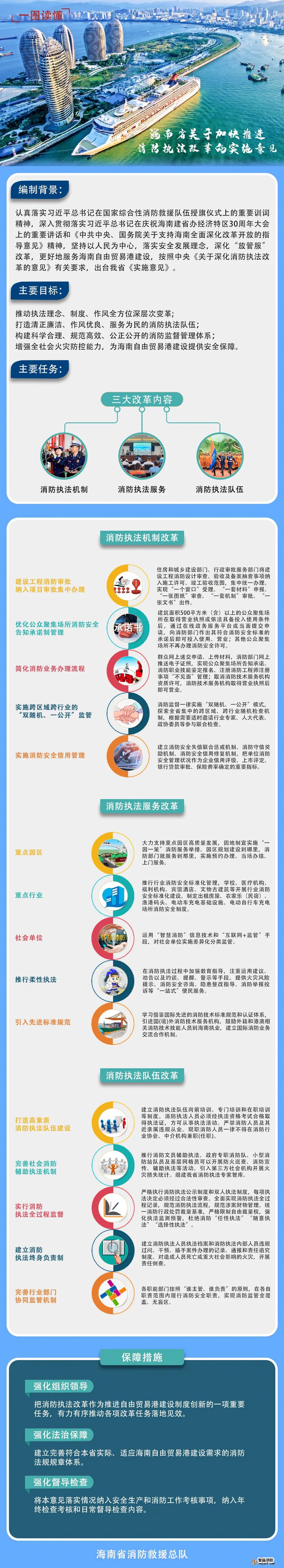 據(jù)介紹,為認(rèn)真貫徹落實(shí)中共中央辦公廳、國(guó)務(wù)院辦公廳印發(fā)的《關(guān)于深化消防執(zhí)法改革的意見》要求,海南省委、省政府于近日正式出臺(tái)了《關(guān)于加快推進(jìn)消防執(zhí)法改革的實(shí)施意見》(以下簡(jiǎn)稱《實(shí)施意見》)?!秾?shí)施意見》從執(zhí)法機(jī)制、消防服務(wù)、執(zhí)法隊(duì)伍3個(gè)方面明確了15項(xiàng)具體改革措施。