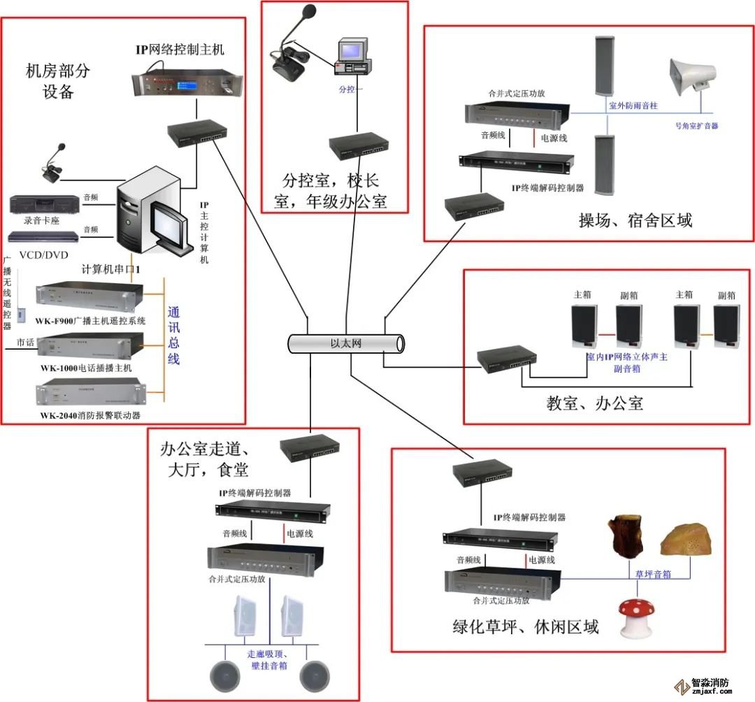 食堂、宿舍樓:食堂、宿舍共分為三個(gè)區(qū)域,三個(gè)區(qū)域可單獨(dú)控制,設(shè)備采用三臺(tái)IP網(wǎng)絡(luò)解碼控制器,三臺(tái)定壓功率放大器,音箱采用5W的吸頂、壁掛音箱。