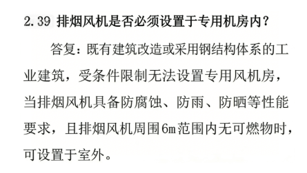 答復:既有建筑改造或采用鋼結(jié)構(gòu)體系的工業(yè)建筑,受條件限制無法設(shè)置專用風機房,當排煙風機具備防腐蝕、防雨、防曬等性能要求,且排煙風機周圍6m范圍內(nèi)無可燃物時,可設(shè)置于室外。