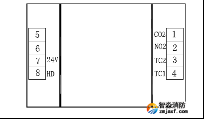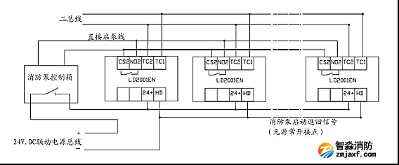 3.利達(dá)LD2001EN消火栓按鈕內(nèi)部接線圖(如圖1.3所示):3、4腳是二總線端子,TC2、TC1無極性,1、2腳是一組無源常開接點,接直接啟泵線(圖1.4),通過電壓小于30V通過電流 100MA,7腳是24V+,8腳是消防泵的反饋線。