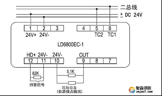 1腳24V+,2腳24V-必須分極性,5、6腳接入TC+、TC-,11、12腳和3、4腳分別為兩組現(xiàn)場反饋信號接入點,需要接82K線路檢測電阻。9、10腳和7、8腳為24V輸出,接5.1K線路檢測電阻。