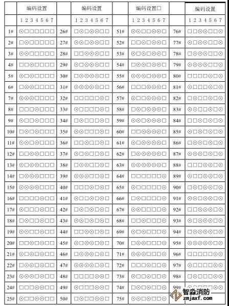 下圖給出了1-99號(hào)的編碼設(shè)置。⊙表示開關(guān)位于ON的位置,□表示開關(guān)位于 OFF的位置; 1#表示1 號(hào)分機(jī)。