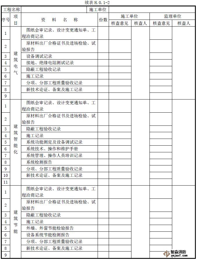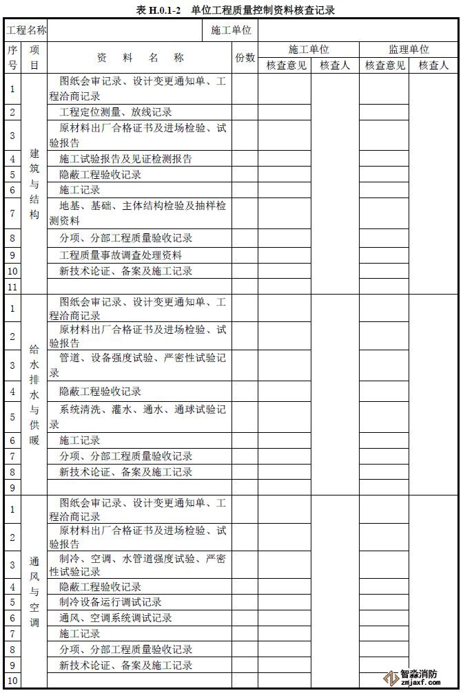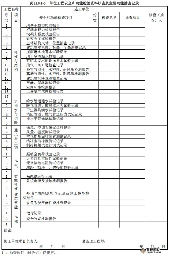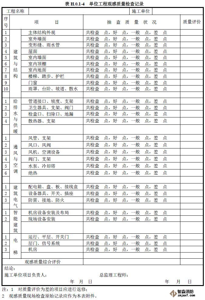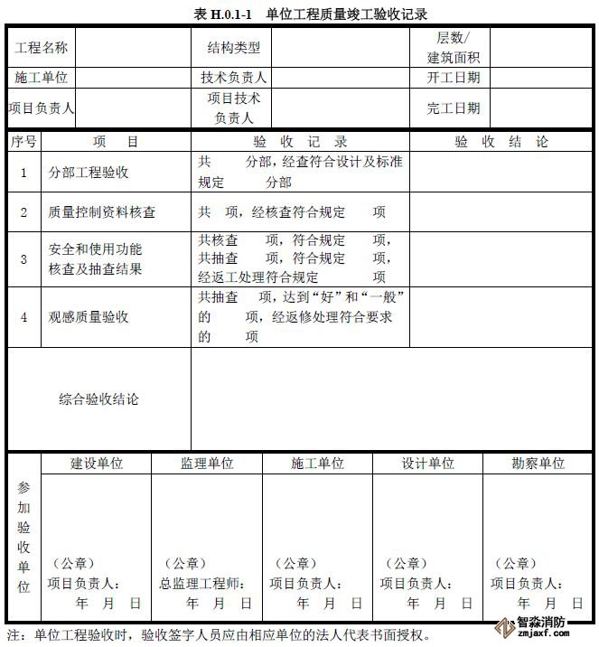 單位工程質(zhì)量竣工驗(yàn)收記錄、質(zhì)量控制資料核查記錄、安全和功能檢驗(yàn)資料核查及主要功能抽查記錄、觀(guān)感質(zhì)量檢查記錄應(yīng)按《建筑工程施工質(zhì)量驗(yàn)收統(tǒng)一標(biāo)準(zhǔn)》附錄H填寫(xiě)。